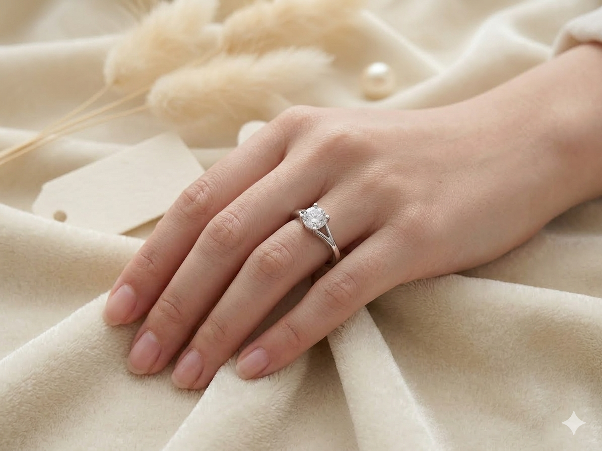 Features a brilliant, round-cut center stone set in a classic four-prong setting.