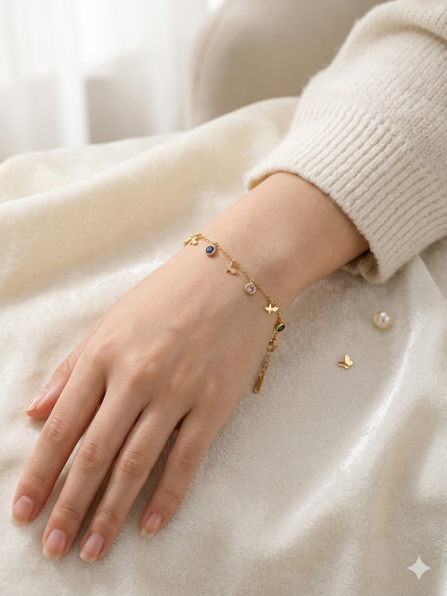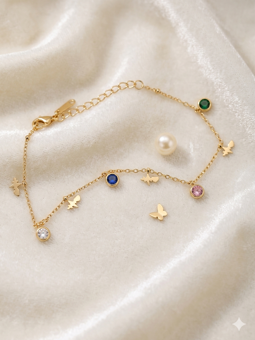 Design: A delicate chain bracelet adorned with small butterfly charms and multi-colored gemstone accents.